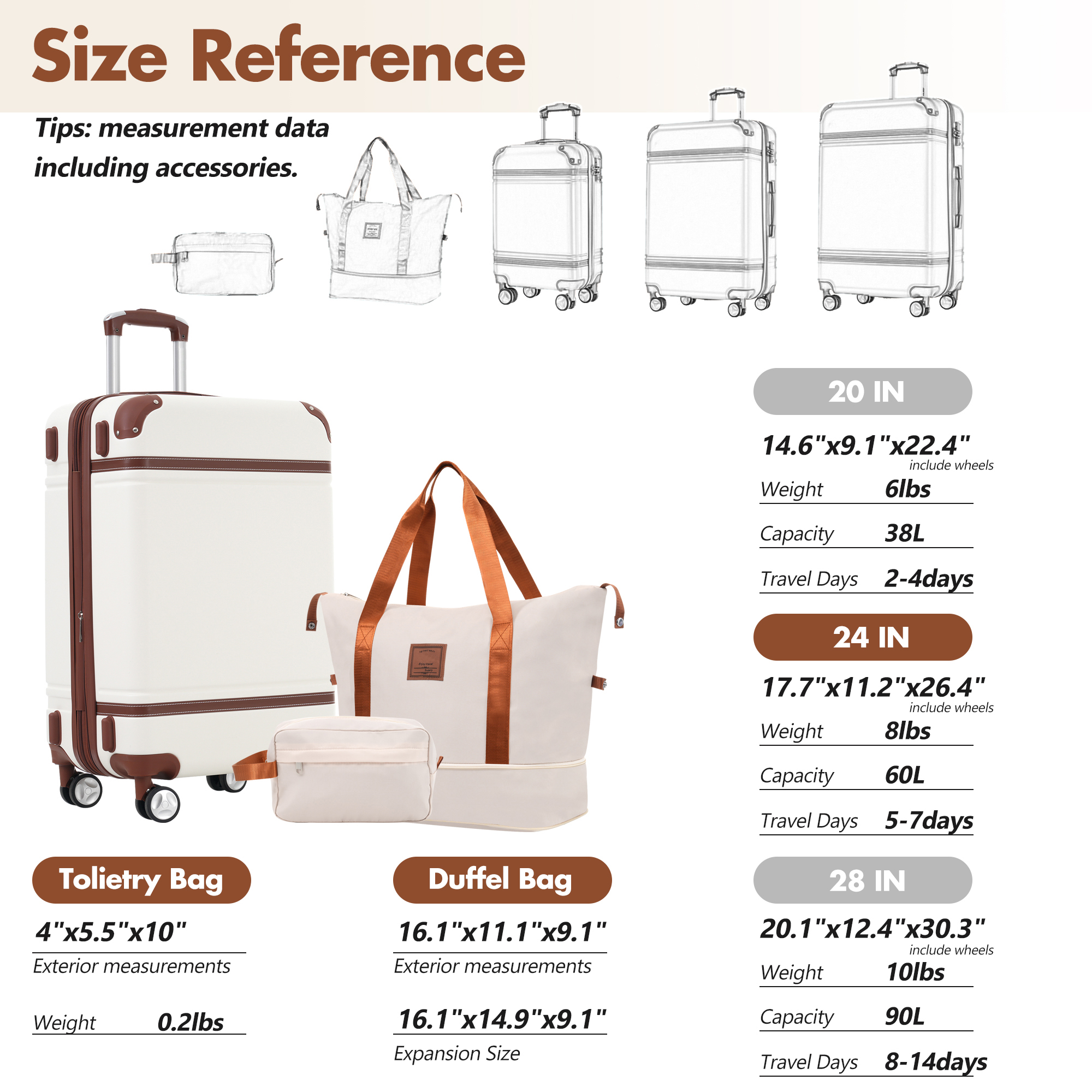 - Size:24 IN luggage dimensions(included accessories): 17.7"x11.2"x26.4"; Expandable travel bag dimensions :longest length: 23", shortest length: 16.1", width: 9.1", height(without extension): 11.1", expansion part height: 3.8"; Toiletry bag dimensions: 10 "x5.5"x4".